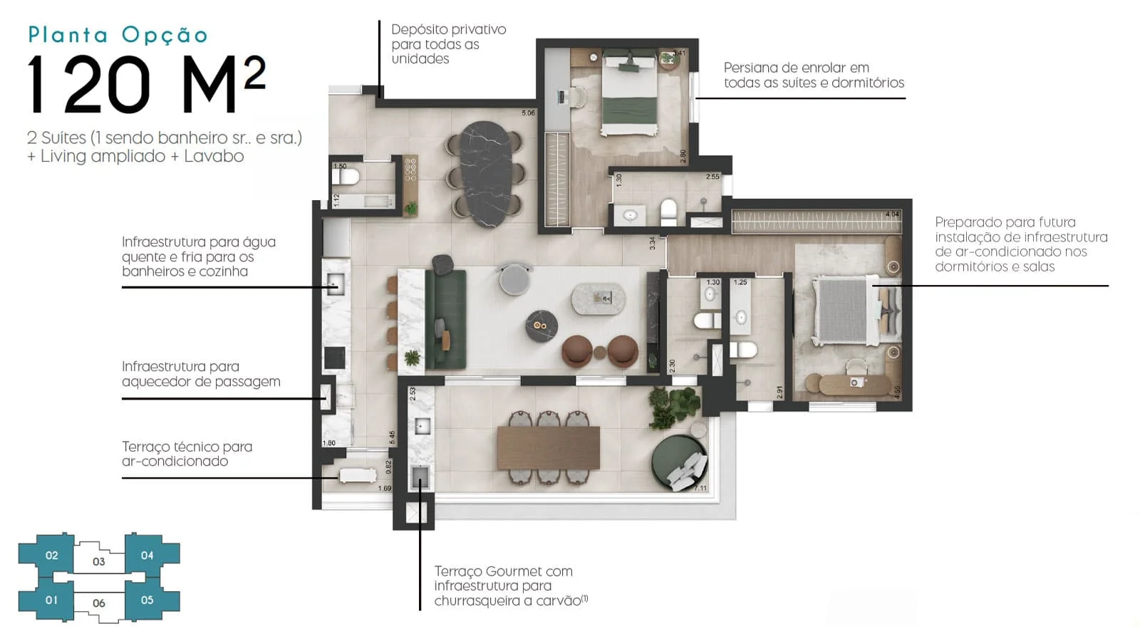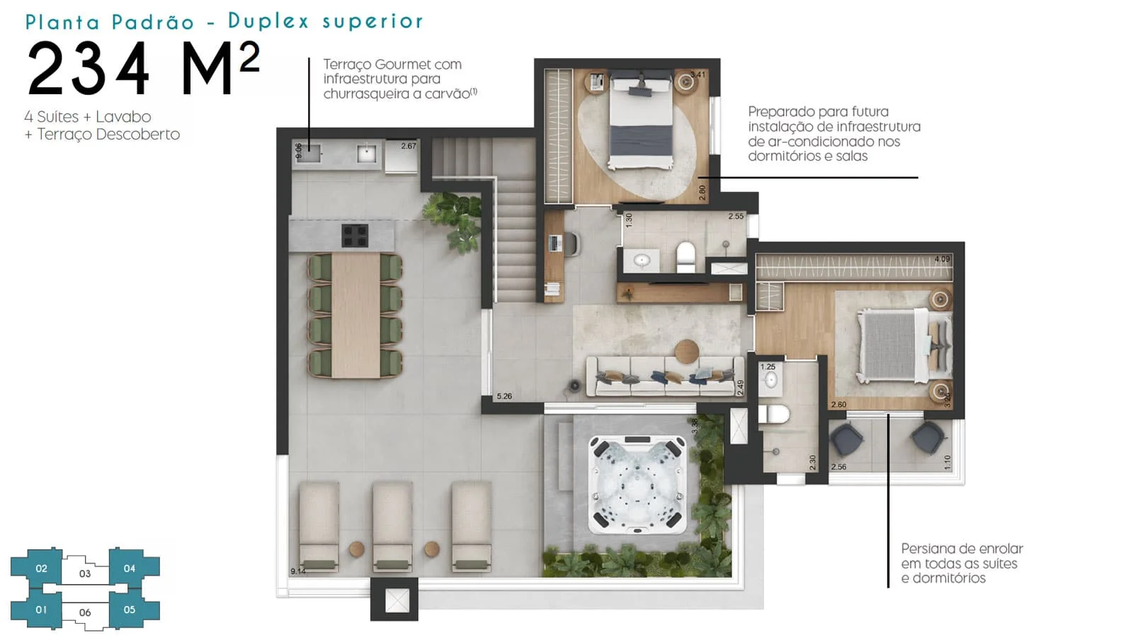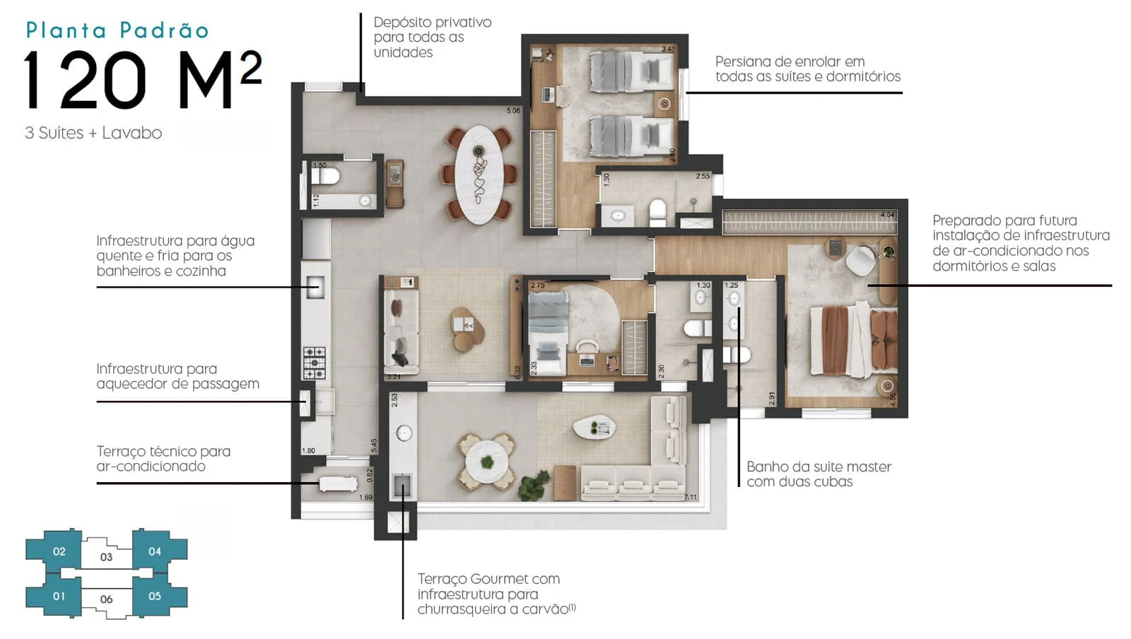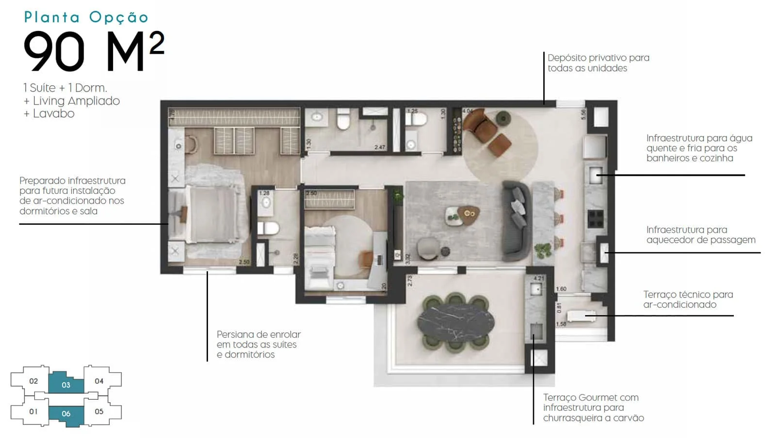 – 03 SUÍTE + LAVABO ou 02 SUÍTE + LIVING AMPLIADO