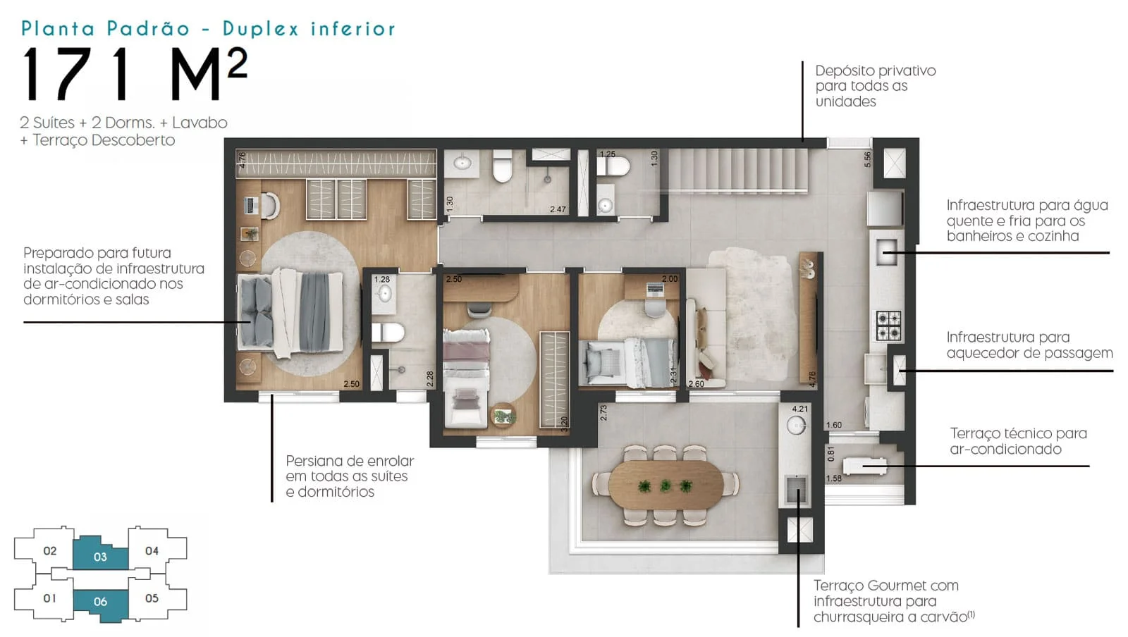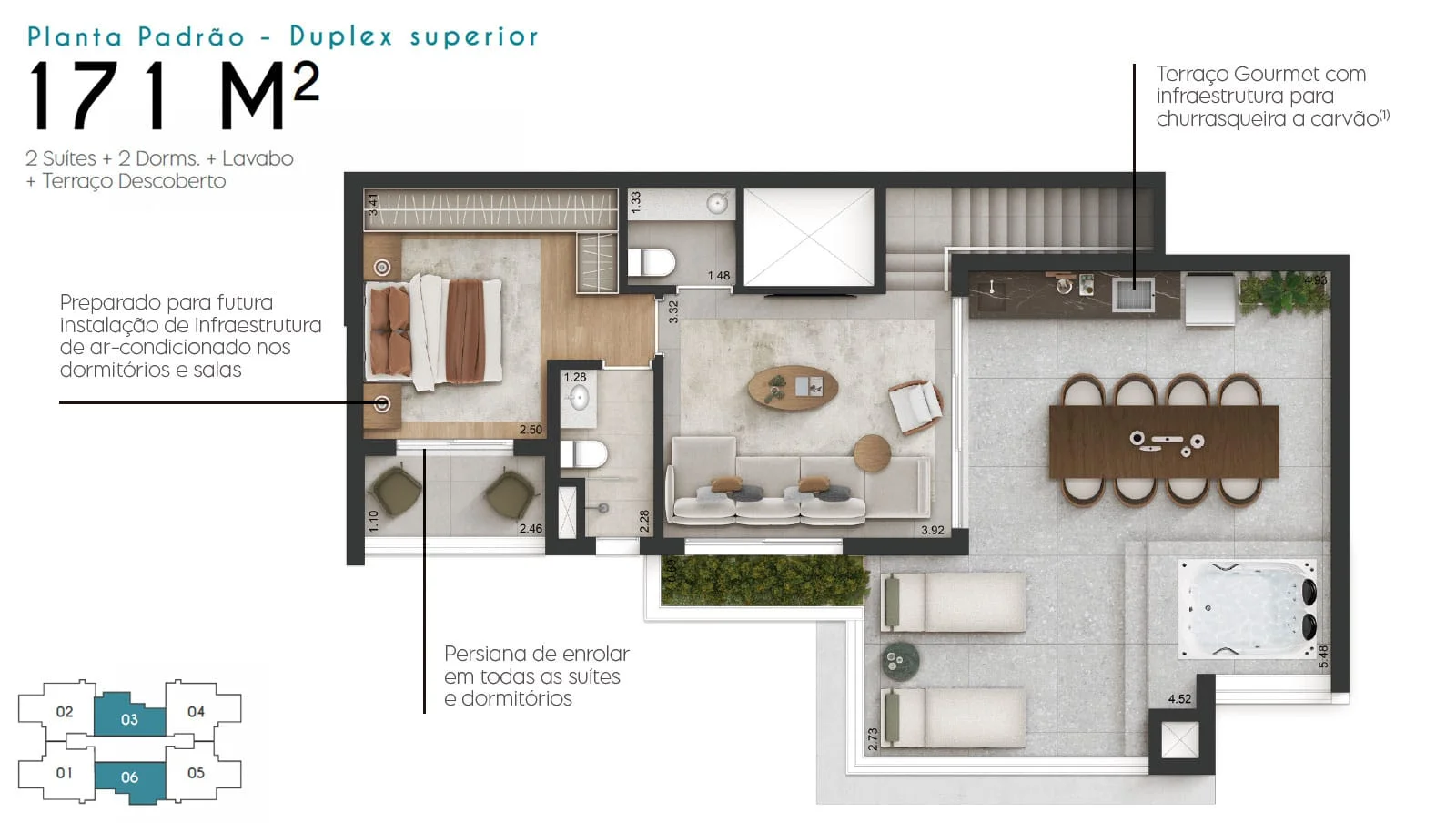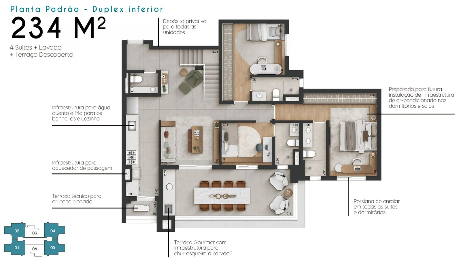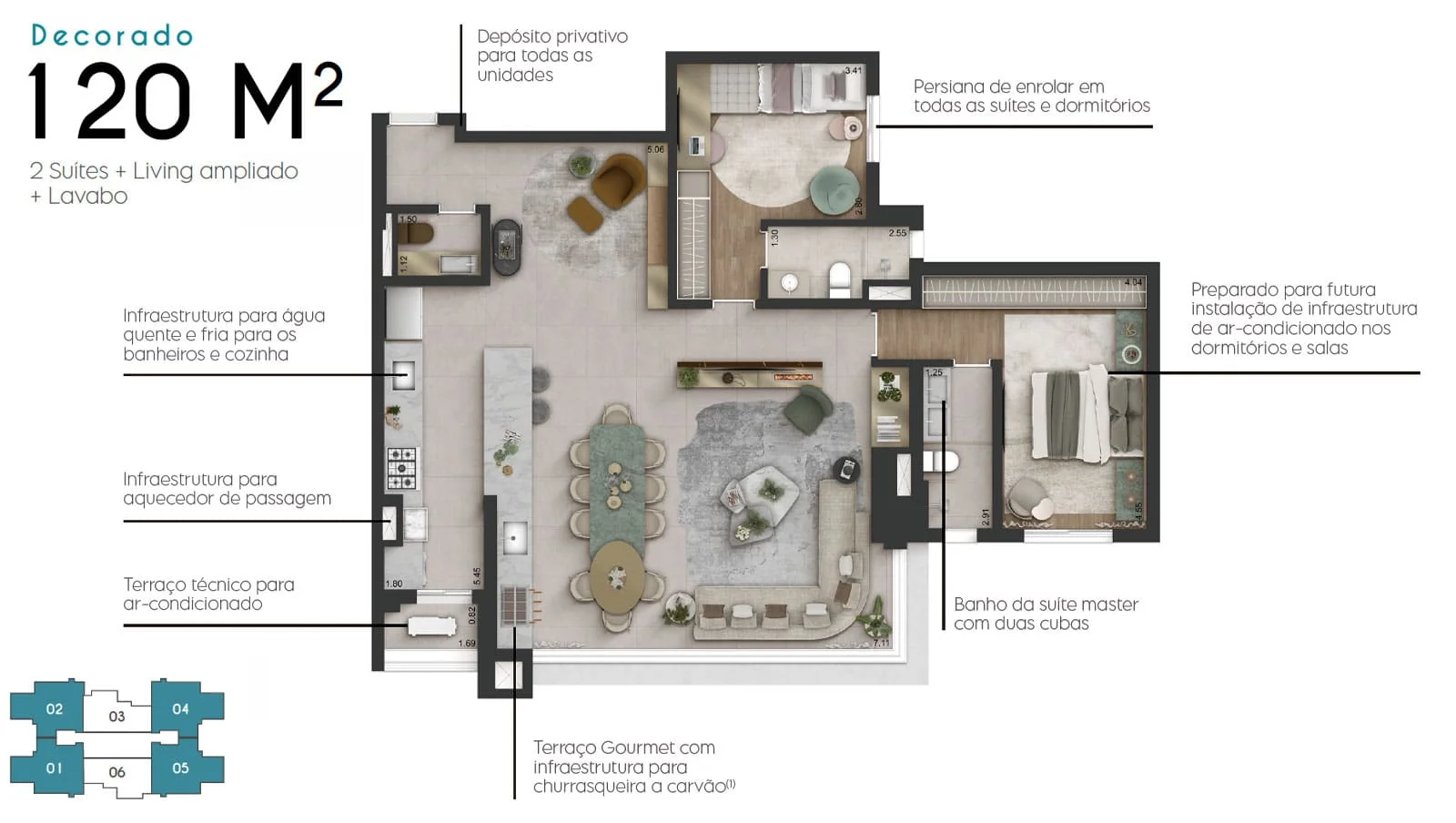 – 03 SUÍTE + LAVABO ou 02 SUÍTE + LIVING AMPLIADO